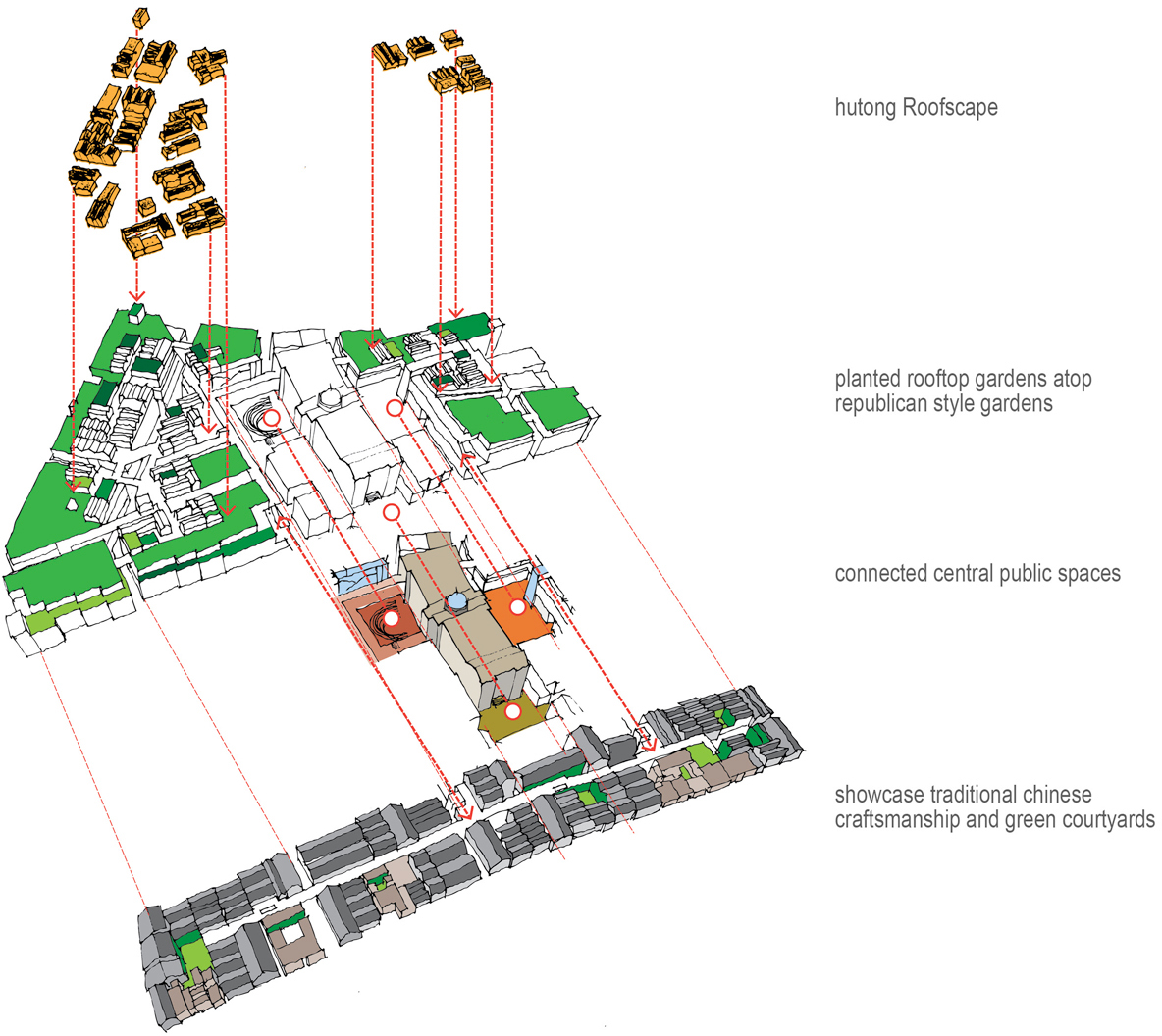 The scheme mediates between the busy, commercial Qianmen Street, the monuments and vast open spaces of Tiananmen Square and the extensive Hutong conservation area to the south and west.